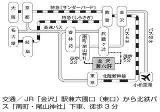 특급 선더버드 → 호쿠리쿠 신칸센 환승(2시간 10분) → 카나자와 역 (동쪽 출입구 버스 승강장: 6번~9번) → 호쿠리쿠 철도 버스 (약 10분) → 미나미마치·오야마 신사 버스 버스 정류장 (양 은행 사이 거리, 상공 회의소 각도) → 도보 5 분 → 호텔 카나자와 켄로쿠소