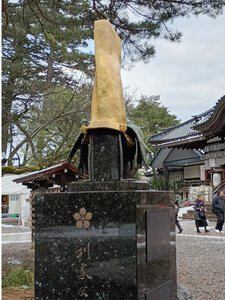 戦国時代を駆け抜けた前田利家公は、金色の鯰尾(なまずお)兜をまとって合戦に赴いたそうです。その兜をまとい威厳を醸し出し兵の士気を高めていたのかも知れません。尾山神社の本殿右側にこの兜をかぶった利家公の銅像があります。